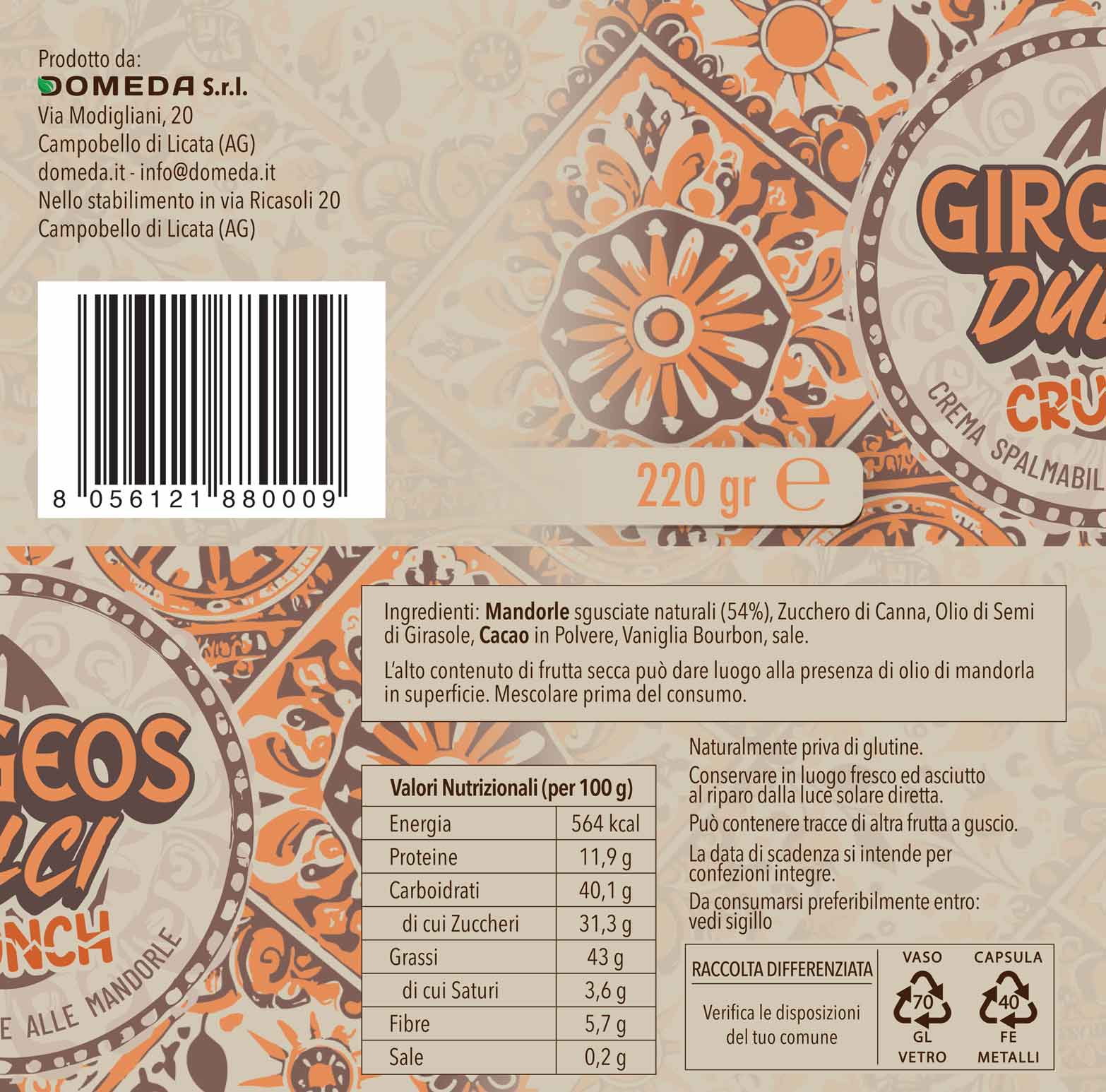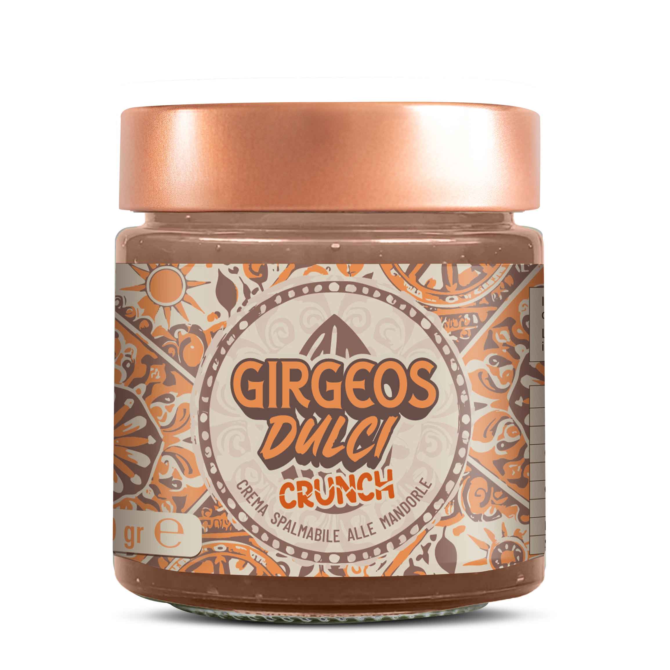 - Girgeos Dulci Crunch (Croccante): Tutta la ricchezza della versione classica, interrotta da una golosa granella di mandorle tostate. La stessa ricetta, per un’esperienza materica e un piacere che “scrocchia”.