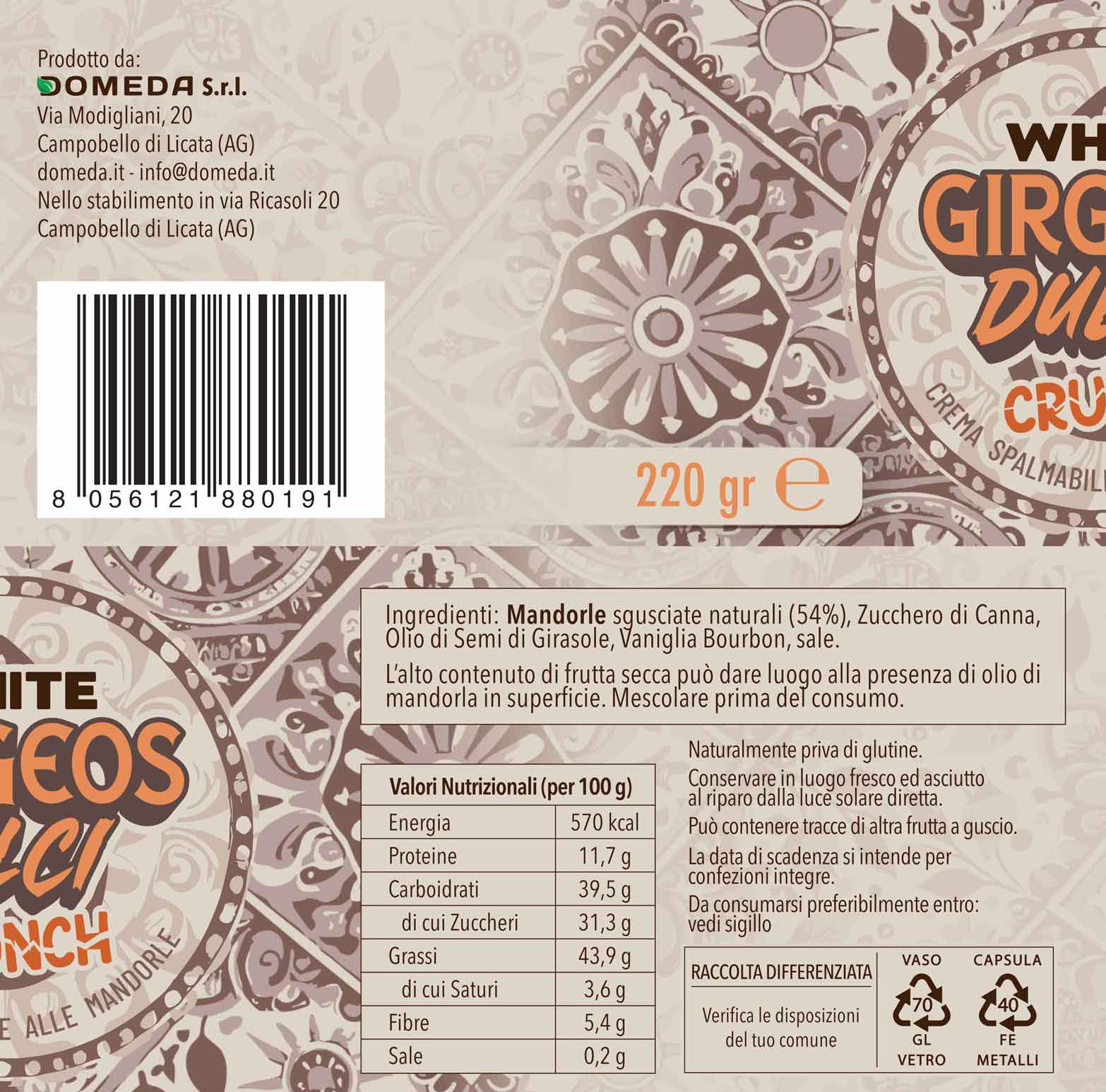 - Girgeos Dulci White Crunch (Croccante): L’essenza della mandorla in purezza incontra la deliziosa granella tostata. Perfetta per chi cerca il gusto “White” ma non vuole rinunciare a una piacevole nota croccante.